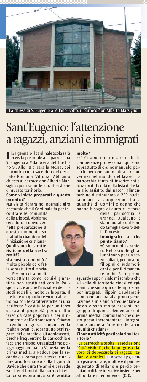 Don Alberto Marsiglio, parroco della parrocchia Sant’Eugenio di Milano che ci ospita, parla anche di noi in una sua intervista rilasciata all’Avvenire in occasione della visita pastorale del Cardinale Scola. In particolare, Don Alberto sottolinea il ruolo del nostro Doposcuola nell’aiutare i ragazzi italiani e stranieri.
